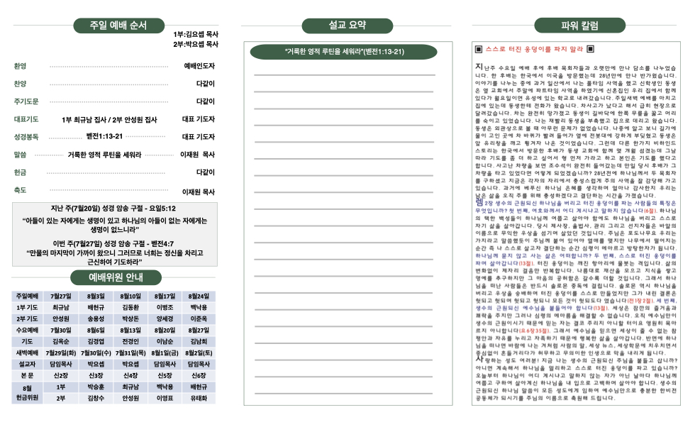 주보 7월27일 주보 Publish on July 26,2025 | 한비전교회 536 페이지 정보 작성자 한비전교회 댓글 0건 조회 536회 작성일 25-07-26 15:09 목록 본문 교회 주보 이전글8월3일 주보 25.08.02 다음글7월 20일 주보 25.07.19 댓글 0 댓글목록 등록된 댓글이 없습니다. 목록