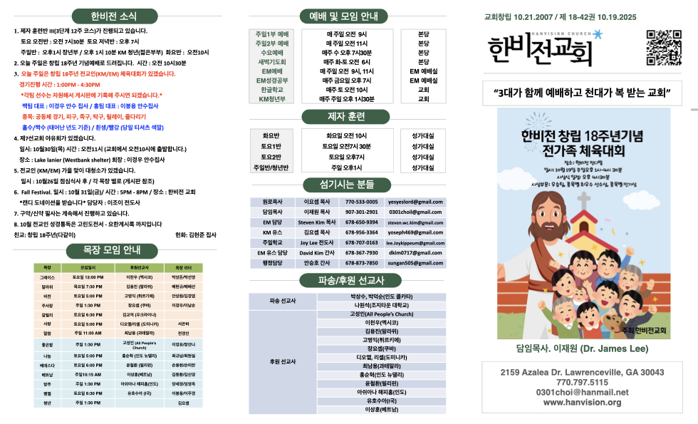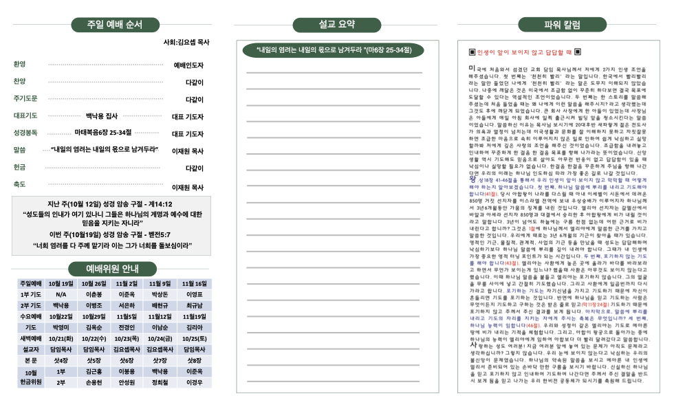 주보 10월 19일 주보 Publish on October 18,2025 | 한비전교회 79 페이지 정보 작성자 한비전교회 댓글 0건 조회 79회 작성일 25-10-18 07:13 목록 본문 교회주보 다음글10월12일 주보 25.10.14 댓글 0 댓글목록 등록된 댓글이 없습니다. 목록