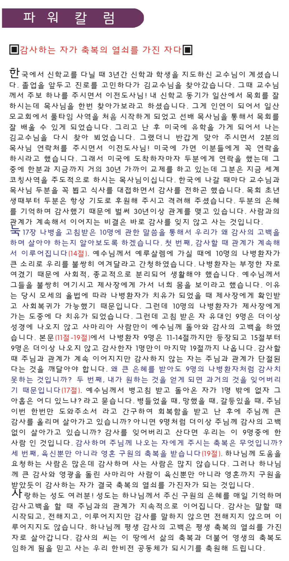 "감사하는 자가 축복의 열쇠를 가진 자다" (11/26/2025) > 파워칼럼