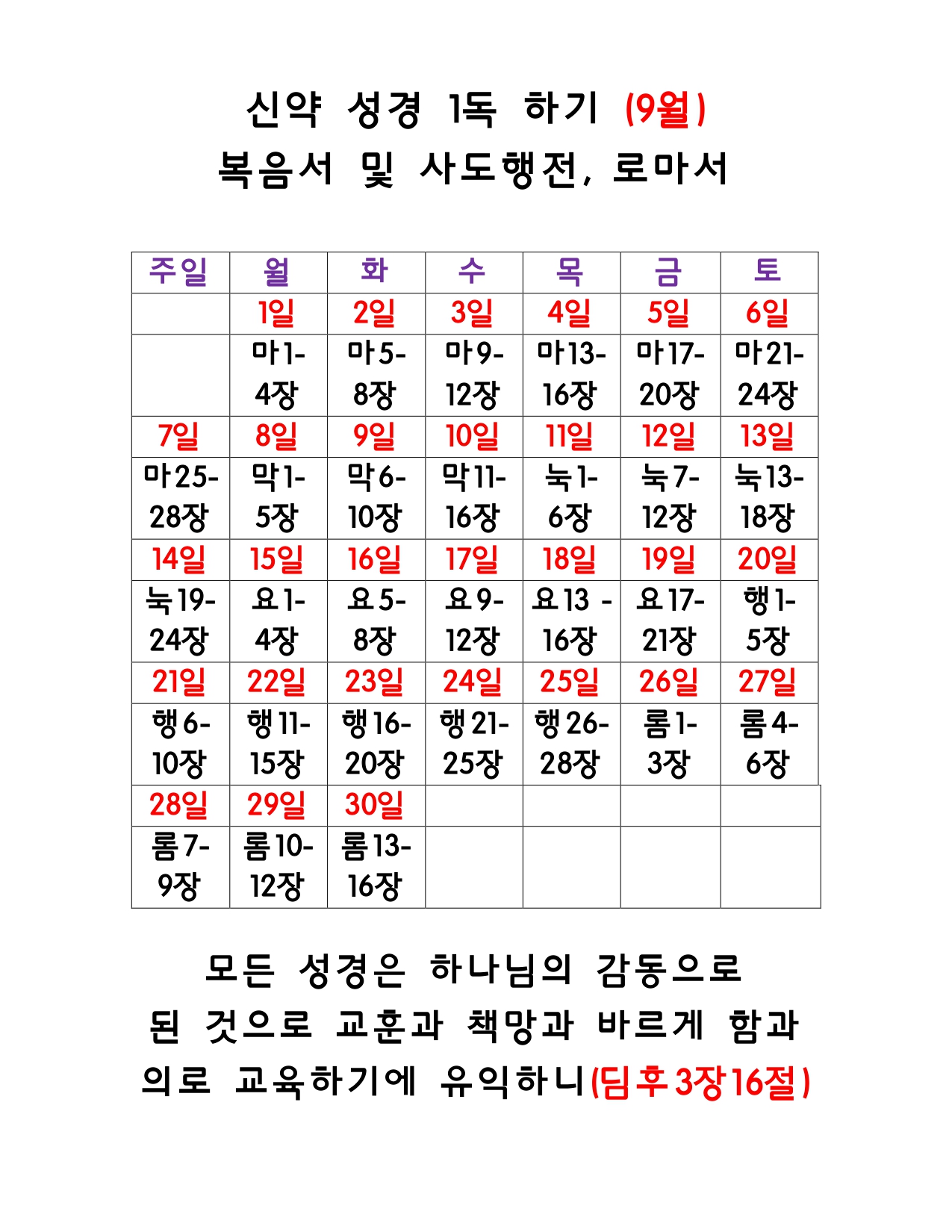 2025년 9월 성경읽기표 Publish on August 28,2025 | 한비전교회 페이지 정보 작성자 한비전교회 댓글 0건 조회 324회 작성일 25-08-28 21:14 목록 본문 2025년 9월 성경읽기표 이전글2025년 10월 성경읽기표 25.09.25 다음글2025년 8월 성경읽기표 25.08.02 댓글 0 댓글목록 등록된 댓글이 없습니다. 목록