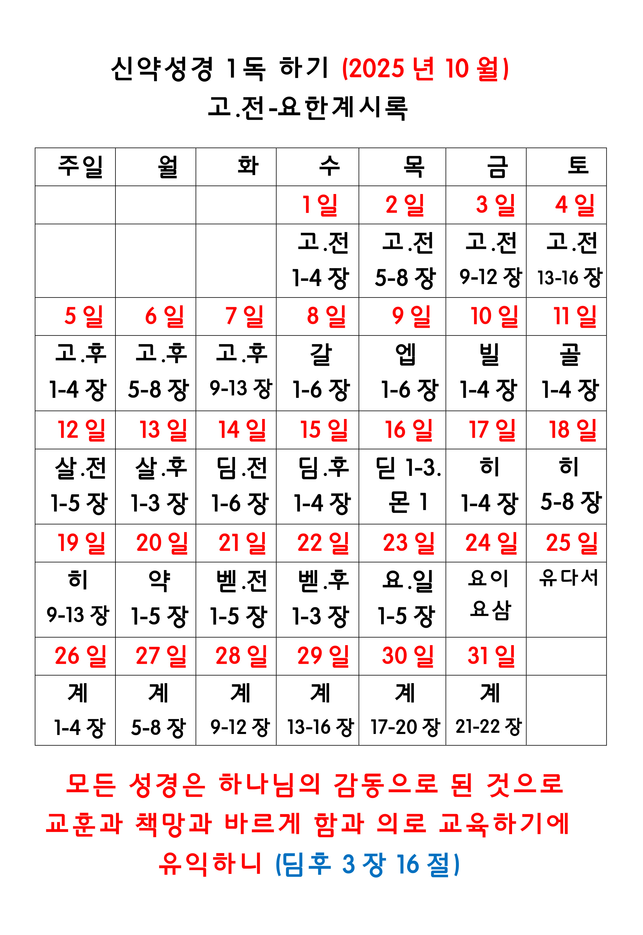 한비전성경통독 2025년 10월 성경읽기표 Publish on September 25,2025 | 한비전교회 페이지 정보 작성자 한비전교회 댓글 0건 조회 208회 작성일 25-09-25 20:21 목록 본문 10월 성경읽기표 다음글2025년 9월 성경읽기표 25.08.28 댓글 0 댓글목록 등록된 댓글이 없습니다. 목록